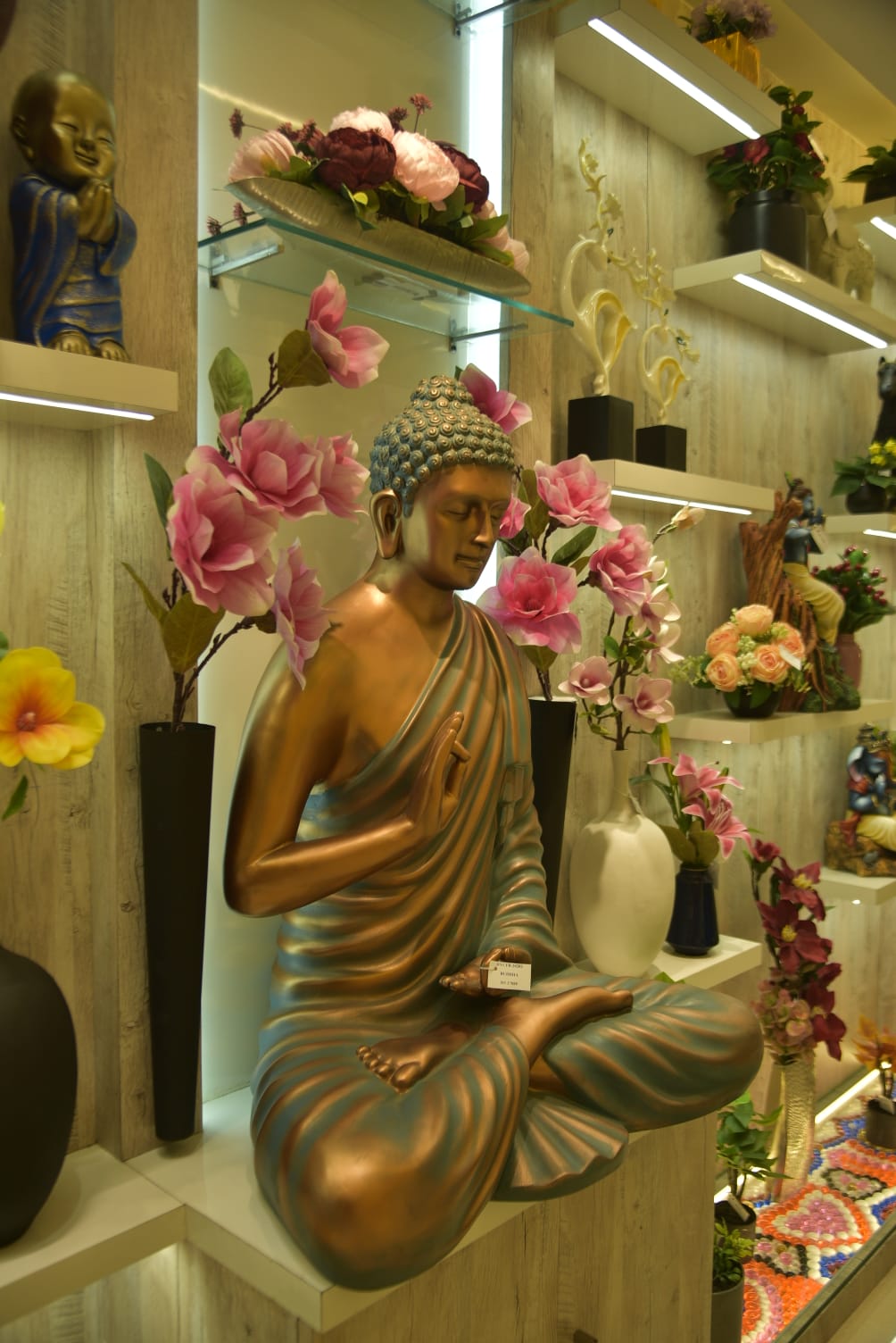 This radiant Buddha statue, seated in a meditative pose with one hand raised in blessing, exudes peace and tranquility. The golden-bronze finish and detailed drapery highlight the statue’s elegance. Surrounded by delicate flowers, it makes a beautiful centerpiece for fostering a serene and mindful atmosphere in any space.