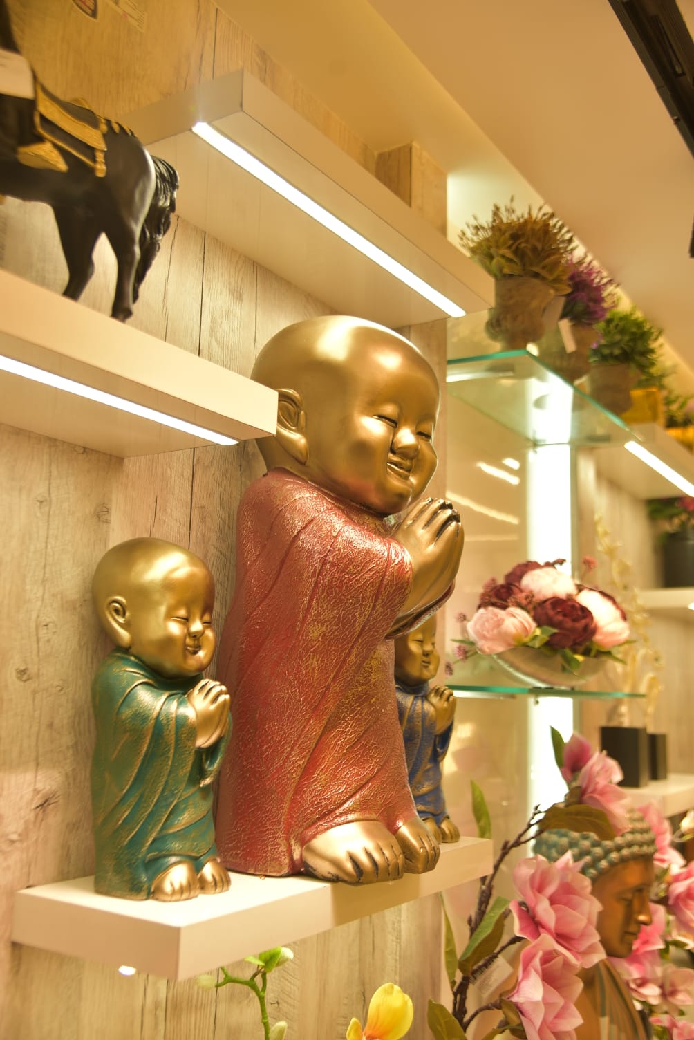 This charming set of Buddha monk statues showcases serene, joyful expressions, symbolizing peace and contentment. Each statue is crafted from high-quality resin with a gold and antique finish, making it an ideal decor piece for any space that seeks a touch of tranquility and spiritual elegance.